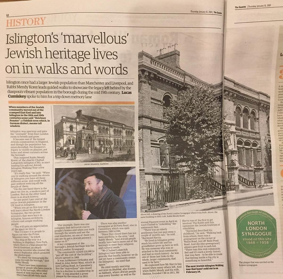 Our Jewish Islington Walking Tour has become a hit as the first date of 2019 sold out within an hour of being shared in Islington Life magazine. We subsequently added two more dates, which in turn resulted in Islington Gazette's feature on Jewish heritage of Islington. The next Jewish Islington Walking Tour takes place on Sunday 31 March. Don't miss it - grab your tickets now!